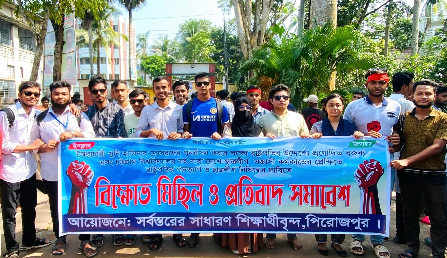 স্বৈরাচারী খুনি হাসিনার দোসরদের পুনর্বাসন করার লক্ষ্যে রাষ্ট্রপতির উদ্দেশ্যে প্রণোদিত বক্তব্য এবং চট্টগ্রাম বিশ্ববিদ্যালয় সহ সারা দেশের ছাত্রলীগ সন্ত্রাসী কর্মকান্ডের প্রেক্ষিতে রাষ্ট্রপতির পদত্যাগ ও ছাত্রলীগ নিষিদ্ধের দাবিতে বিক্ষোভ মিছিল ও প্রতিবাদ সমাবেশ করেছে পিরোজপুর সরকারি সোহরাওয়ার্দী কলেজের সাধারণ শিক্ষার্থীরা। আজ মঙ্গলবার বেলা ১১ টায় সরকারি সোহরাওয়ার্দী কলেজ প্রাঙ্গণ থেকে কলেজের সাধারণ শিক্ষার্থীদের উপস্থিতিতে একটি বিক্ষোভ মিছিল বের হয়ে শহরে বিভিন্ন স্থান প্রদক্ষিণ করে কলেজ ক্যাম্পাসে বিক্ষোভ মিছিল শেষ হয়। পরে সাধারণ শিক্ষার্থীরা সমাবেশে মিলিত হয়। এ সময় পিরোজপুর সরকারি সোহরাওয়ার্দী কলেজের সাধারণ শিক্ষার্থীরা সহ জেলার বিভিন্ন শিক্ষা প্রতিষ্ঠানের শিক্ষার্থীরা উপস্থিত ছিলেন।