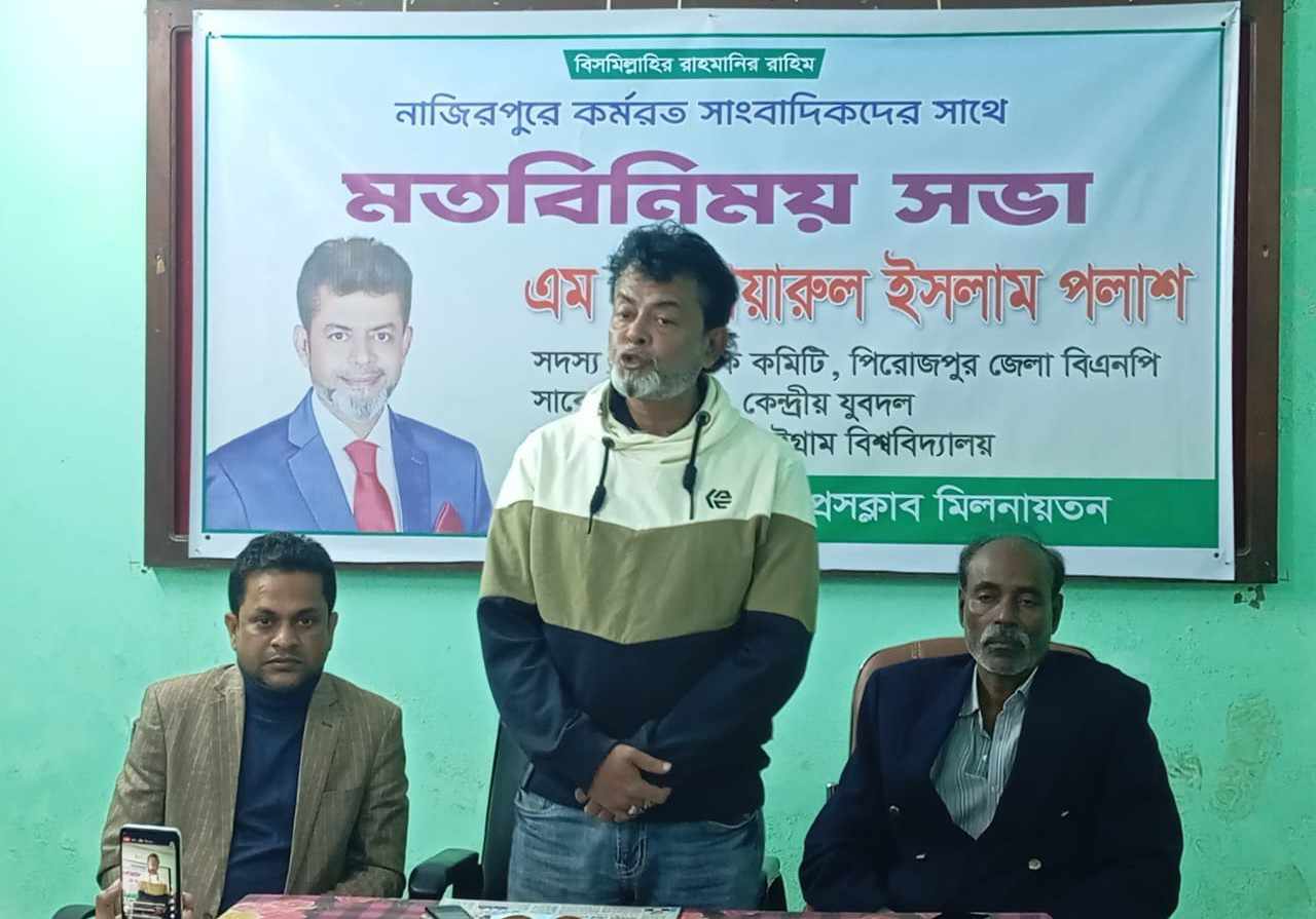 নাজিরপুর প্রেস ক্লাবের সভাপতি কে,এম সাঈদ এর সভাপতিত্বে মতবিনিময় সভায় বক্তব্য রাখেন, নাজিরপুর প্রেসক্লাবের সাধারণ সম্পাদক এস,এম সিপার, যুগ্ম সাধারণ অনুপ কুমার সিকদার। এসময়ে আরো উপস্থিত ছিলেন দৈনিক কালেরকণ্ঠের সাংবাদিক ওহিদুজ্জামান চঞ্চল, দৈনিক যায়যায় দিনের সাংবাদিক মশিউর রহমান, দৈনিক নয়া দিগন্তের সাংবাদিক আল আমিন হাজরা, দৈনিক ইনক্লাবের সাংবাদিক জাহিদ হোসেন, দৈনিক মানবজমিনের সাংবাদিক হাসান, কালবেলার উথান মন্ডল সহ নাজিরপুরে কর্মরত সাংবাদিকরা।