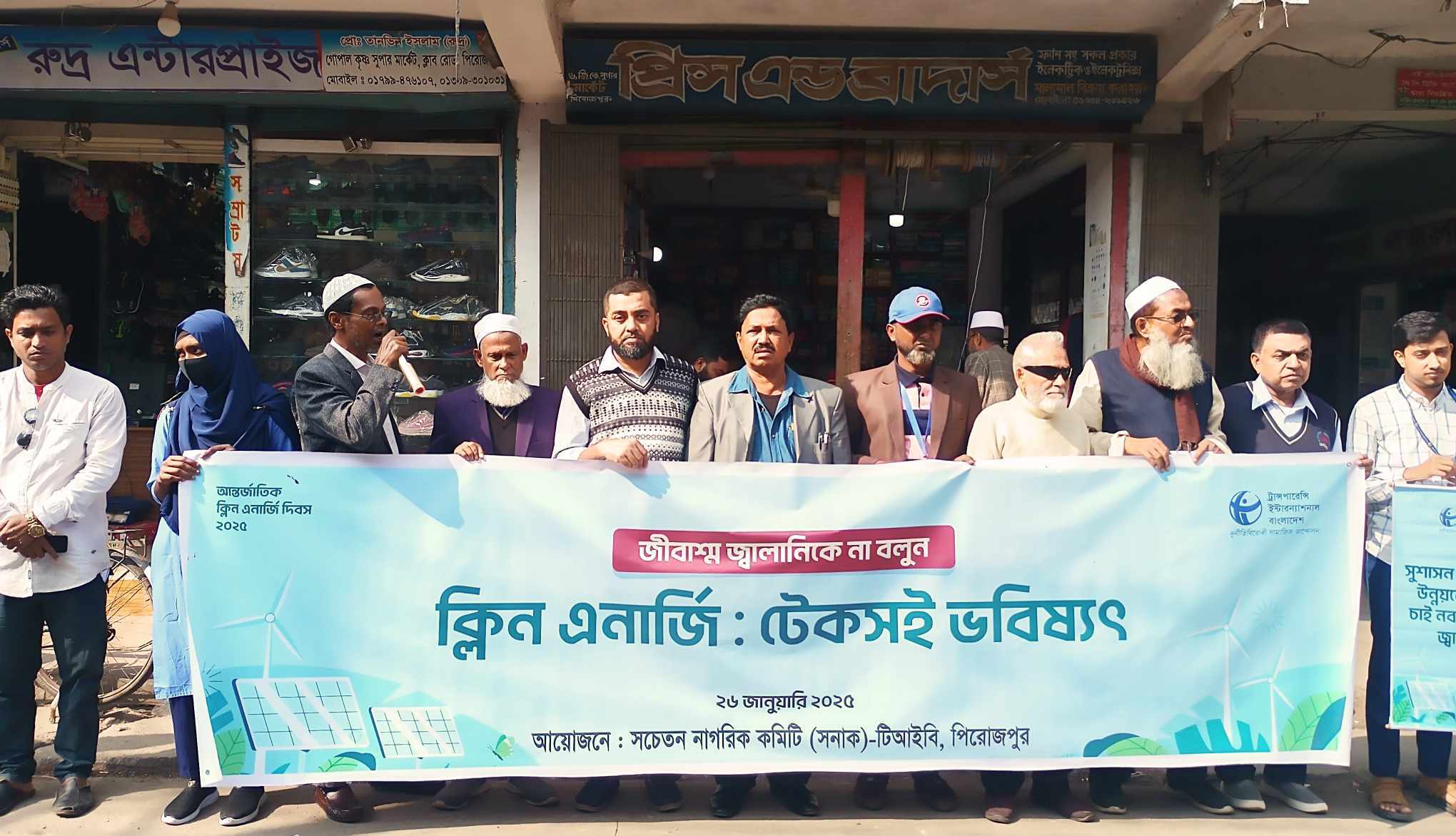 পিরোজপুর প্রতিনিধিঃ পিরোজপুরে ‘জীবাশ্ম জ্বালানিকে না বলুন ‘এবং ‘ক্লিন এনার্জি -টেকসই ভবিষ্যৎ’এই স্লোগানকে সামনে রেখে মানববন্ধন অনুষ্ঠিত হয়েছে।