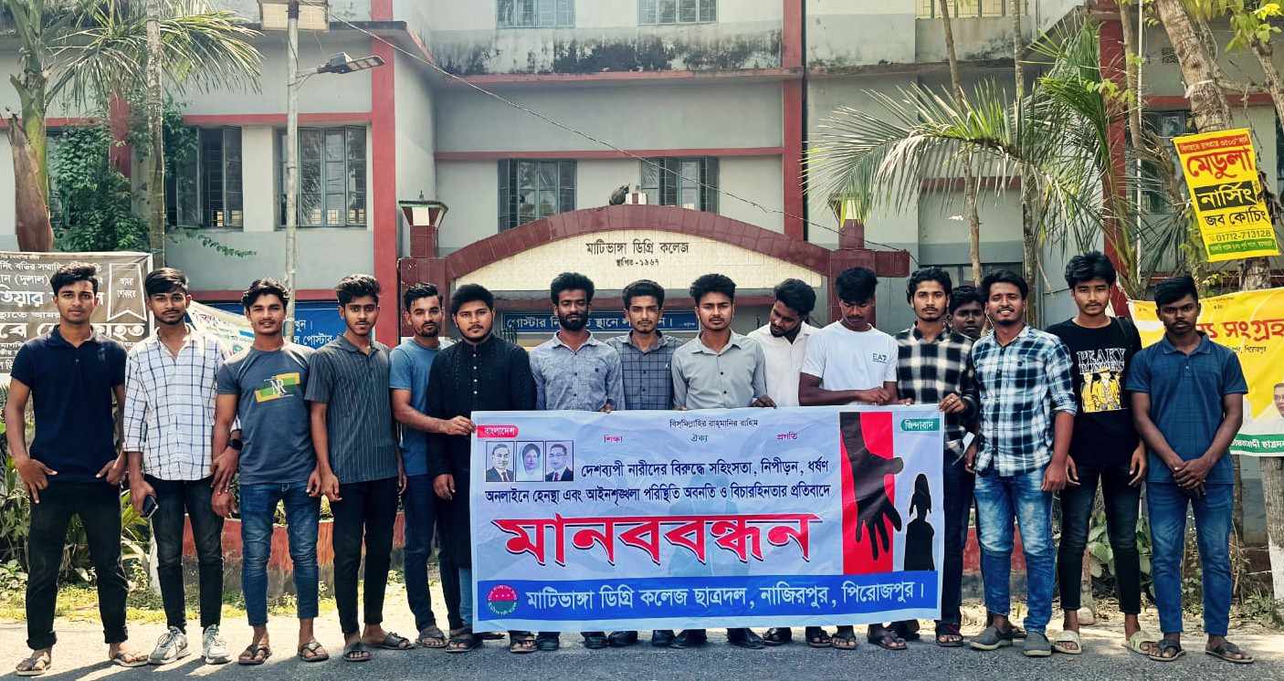 নাজিরপুর প্রতিনিধিঃ দেশব্যাপী নারীদের বিরুদ্ধে সহিংসতা, নিপীড়ন, ধর্ষন অনলাইনে হেনেস্তা এবং আইনশৃঙ্খলা অবনতি ও বিচারহীনতার প্রতিবাদে পিরোজপুরের নাজিরপুর মাটিভাংগা ডিগ্রী কলেজ ছাত্রদলের মানববন্ধন অনুষ্ঠিত।
