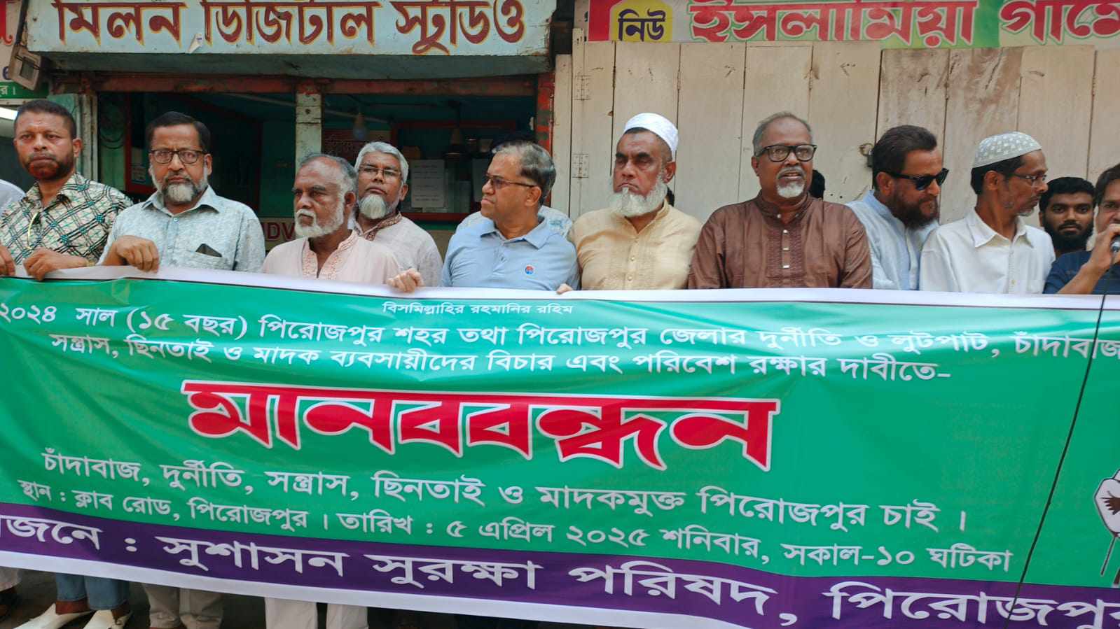 শনিবার (৫ এপ্রিল) সকালে শহরের ক্লাব সড়কে সুশাসন সুরক্ষা পরিষদ পিরোজপুর এর ব্যানারে মানববন্ধন অনুষ্ঠিত হয়। এলাকার শান্তি-শৃঙ্খলা বজায় রাখার লক্ষ্যে এলাকার কয়েক শ মানুষ ঘন্টাব্যাপী এ কর্মসূচিতে যোগ দেয়। সংগঠনের আহবায়ক সুপ্রিম কোর্টের আইনজীবী মেজর (অবঃ) ব্যারিষ্টার এম সরোয়ার হোসেন, মেজর (অবঃ) ব্যরিস্টার এম সরোয়ার হোসেন বলেন, ২০০৯-২০২৪ সাল (১৫বছর) পিরোজপুর শহর তথা জেলার দুর্নীতি ও লুটপাট, চাঁদাবাজ, সন্ত্রাস, ছিনতাই ও মাদক ব্যাবসায়ীদের বিচার এবং পরিবেশ রক্ষার দাবীতে এ কর্মসূচি এবং এলাকাবাসীর সামনে সাংবাদিকদের কাছে তা প্রকাশ করেন। এবং সাপ্লাই পানির নামে প্রতারণা করে আসছিল ও মশার উপদ্রবে অতিষ্ঠসহ মাদক কারবারি ও সন্ত্রাসীদের বিরুদ্ধে আইনগত ব্যবস্থা নেওয়ার জন্য প্রশাসনের প্রতি আহবান জানান তিনি।